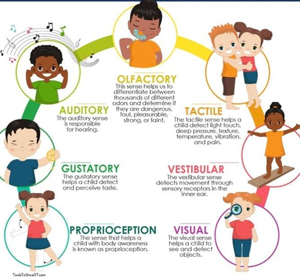 Sensory integration is a term that has been used to describe processes in the brain that allow us to take information we receive from our 5 senses, organize it, and respond appropriately. We also have a vestibular sense (balance) that tells us how to position our bodies and heads, and a proprioceptive sense (awareness of body in space) that helps us know what we do with our joints, muscles, and ligaments.